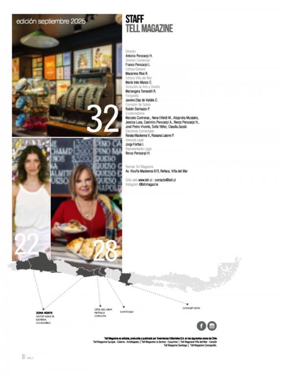 Tell Magazine es una revista nacional con vocación regional que nació en Junio de 2002 en la ciudad de Viña del Mar. A través de sus secciones misceláneas, entrevistas, reportajes y vida social busca rescatar emprendedores, empresarios, deportistas y talentos regionales.
