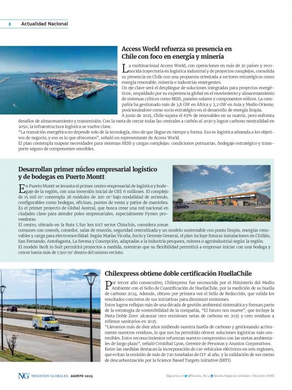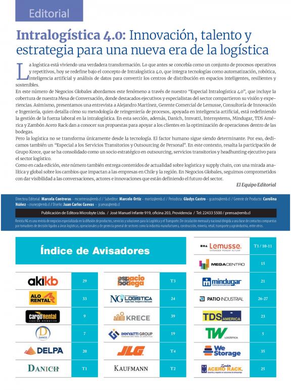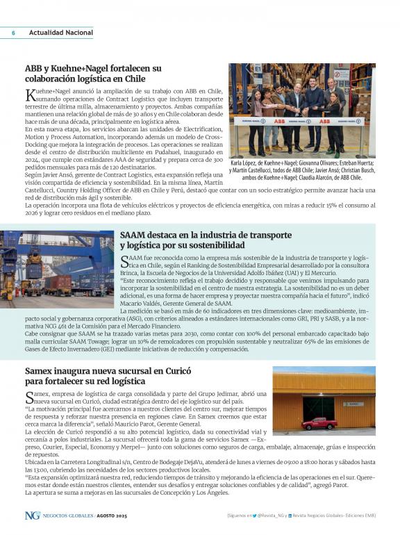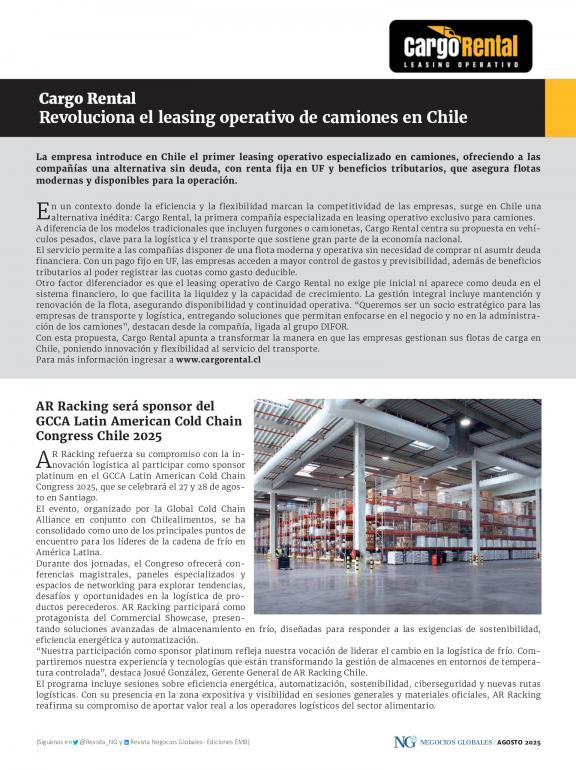 Negocios Globales es una revista de Logística, orientada a presentar novedades en productos y tecnologías en las áreas de Almacenamiento, Distribución y Transporte. Con un enfoque que mezcla lo informativo y testimonial, Negocios Globales se distribuye en forma mensual a ejecutivos tomadores de decisión en las áreas logísticas y afines. Es una revista de negocios que acerca a las empresas proveedoras con sus potenciales clientes.